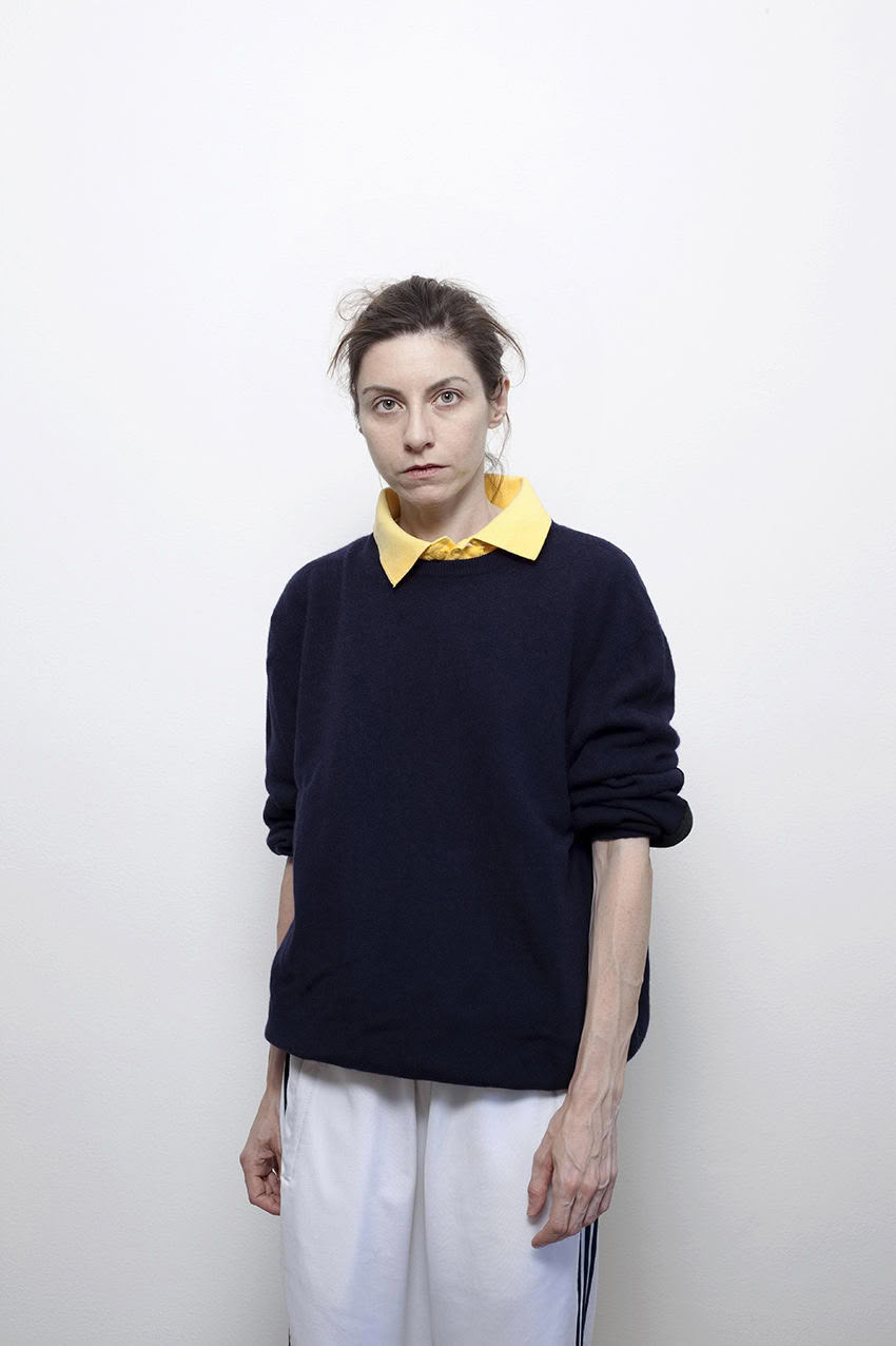 "La prima immagine che ha dato vita al progetto (quella con il maglione blu e il colletto giallo che spunta), è quella in cui indosso gli abiti che vestiva mio padre il giorno che è morto ed è stata scattata poco dopo (2012)".