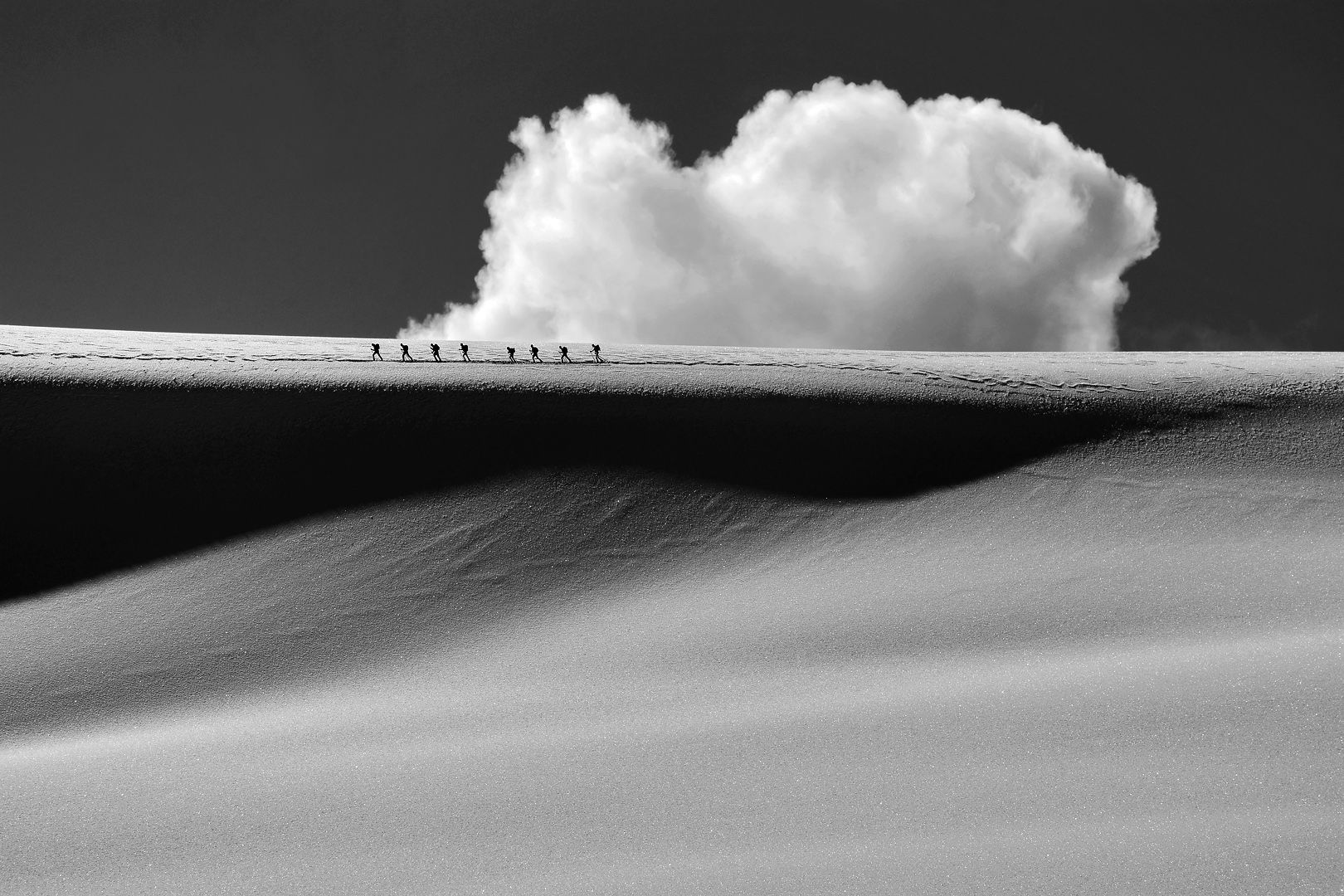 La mostra “Il confine bianco” è strutturata attraverso stampe ad alta qualità (stampa lambda) su pannelli di grande formato (75x50 o 100x70), sia a colori che in bianco e nero, che ben rappresentano l’idea del rapporto tra l’uomo e la montagna, nel silenzio del paesaggio innevato. Si può comporre con un numero di immagini variabile da un minimo di 10-15 ad un massimo di 25-30 a seconda degli spazi disponibili.