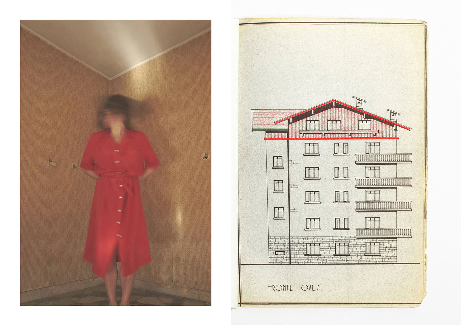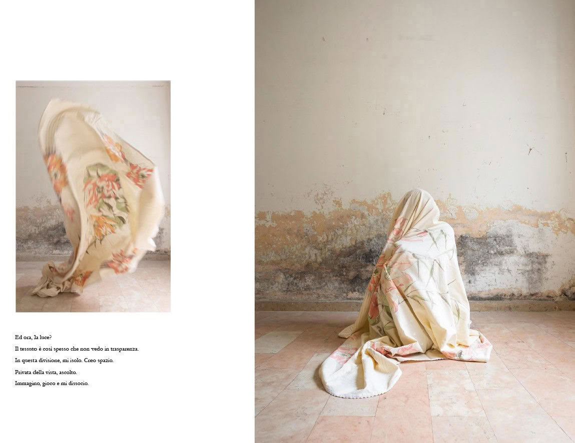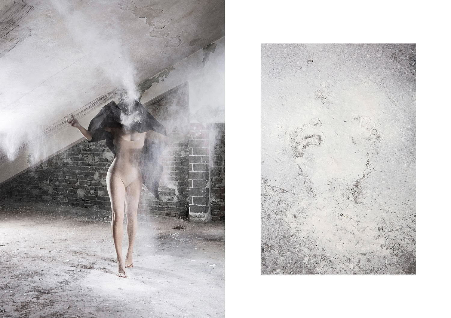 Per ogni piano ha inscenato una sequenza di autoritratti. Ha cercato un dialogo con quanto ha avuto a disposizione: la macchina fotografica, il suo corpo ed il luogo in cui si trovava. Nelle fotografie ha raffigurato la sua esperienza tra le stanze di questo palazzo, vivendo con esso la trasformazione in simbiosi. Strati di struttura come strati di coscienza. La consapevolezza che, in quella casa vuota, potesse essere chiunque. Ha deciso quindi di indagare il rapporto con il tempo, con la sostanza e con la fine.