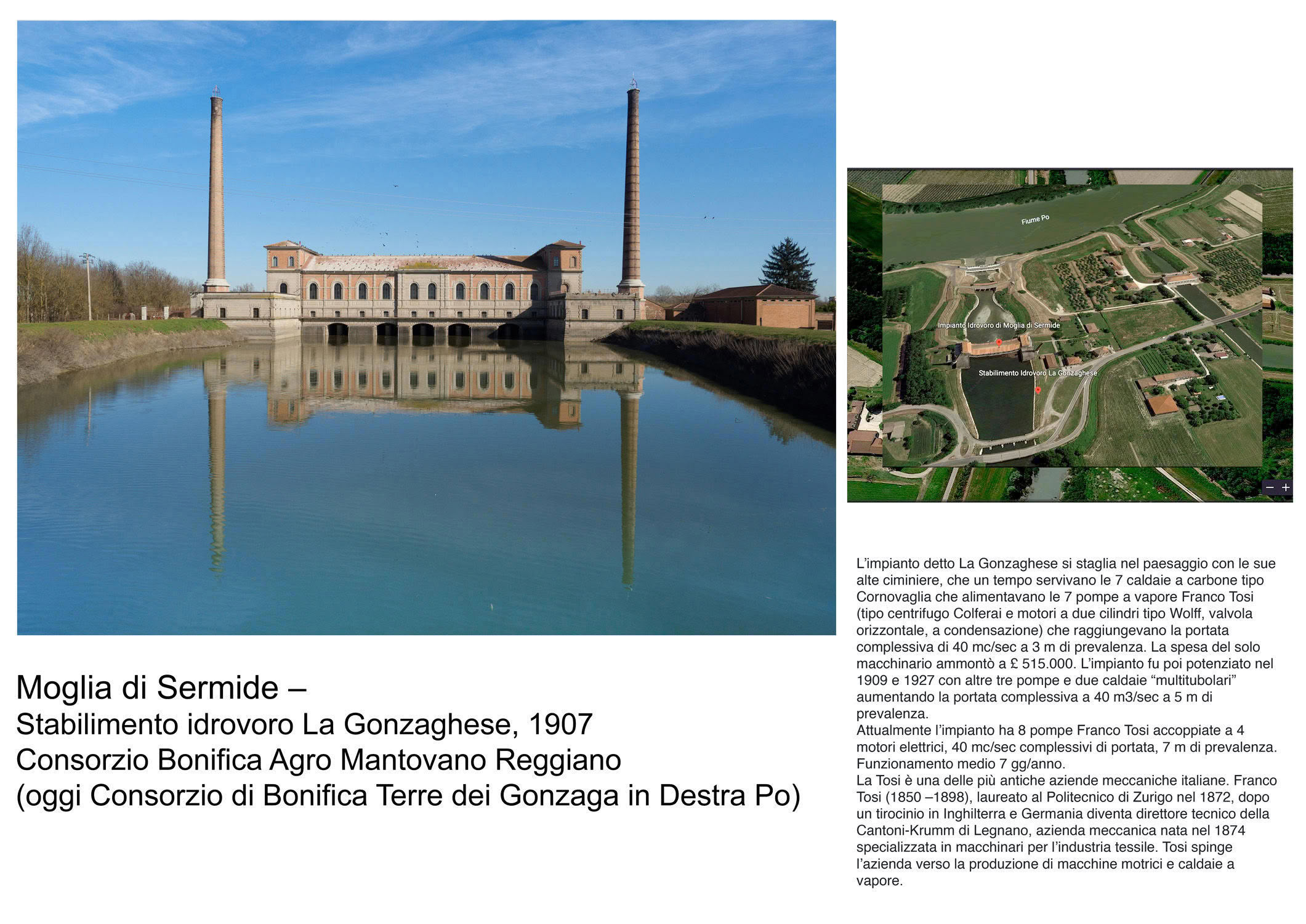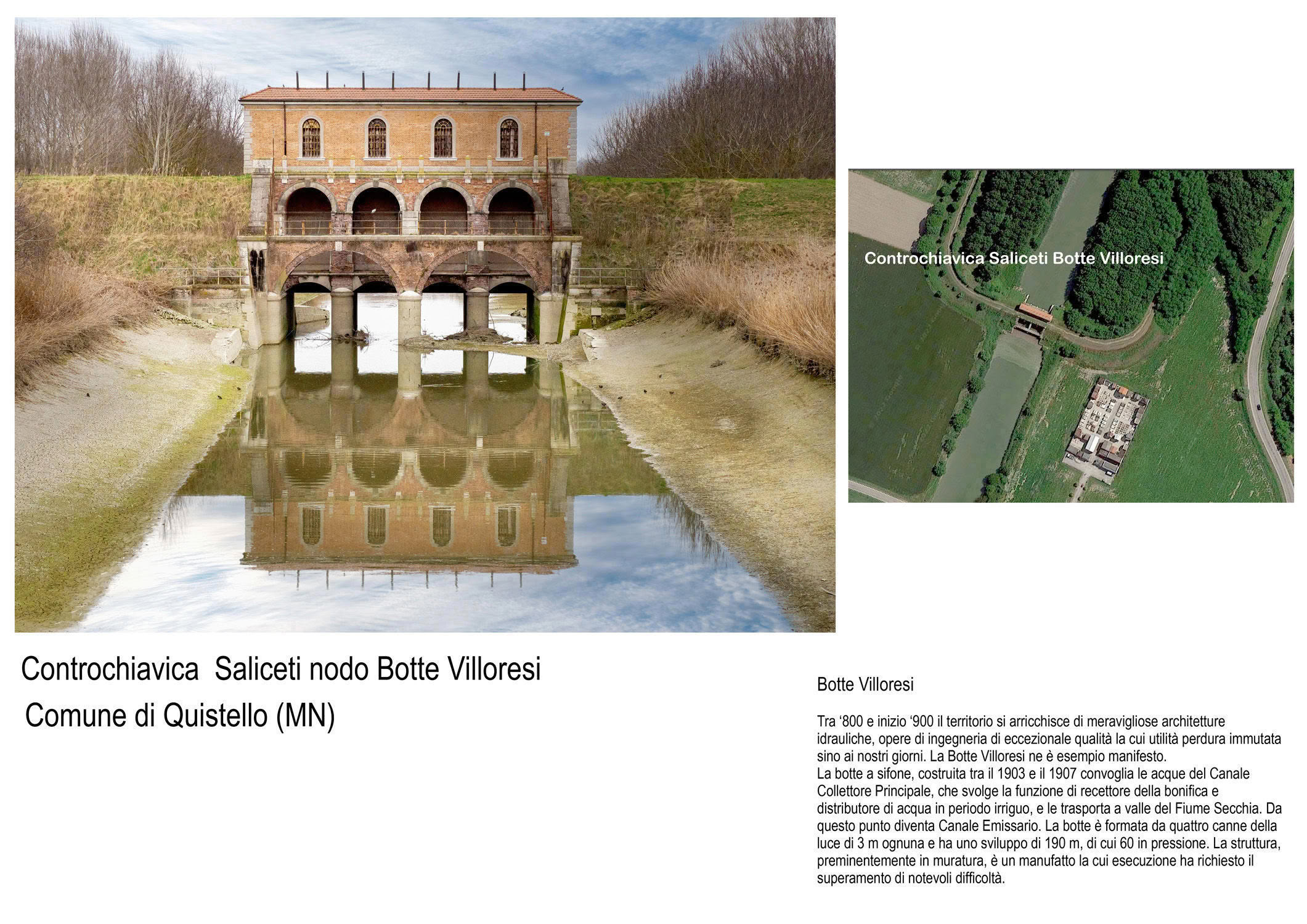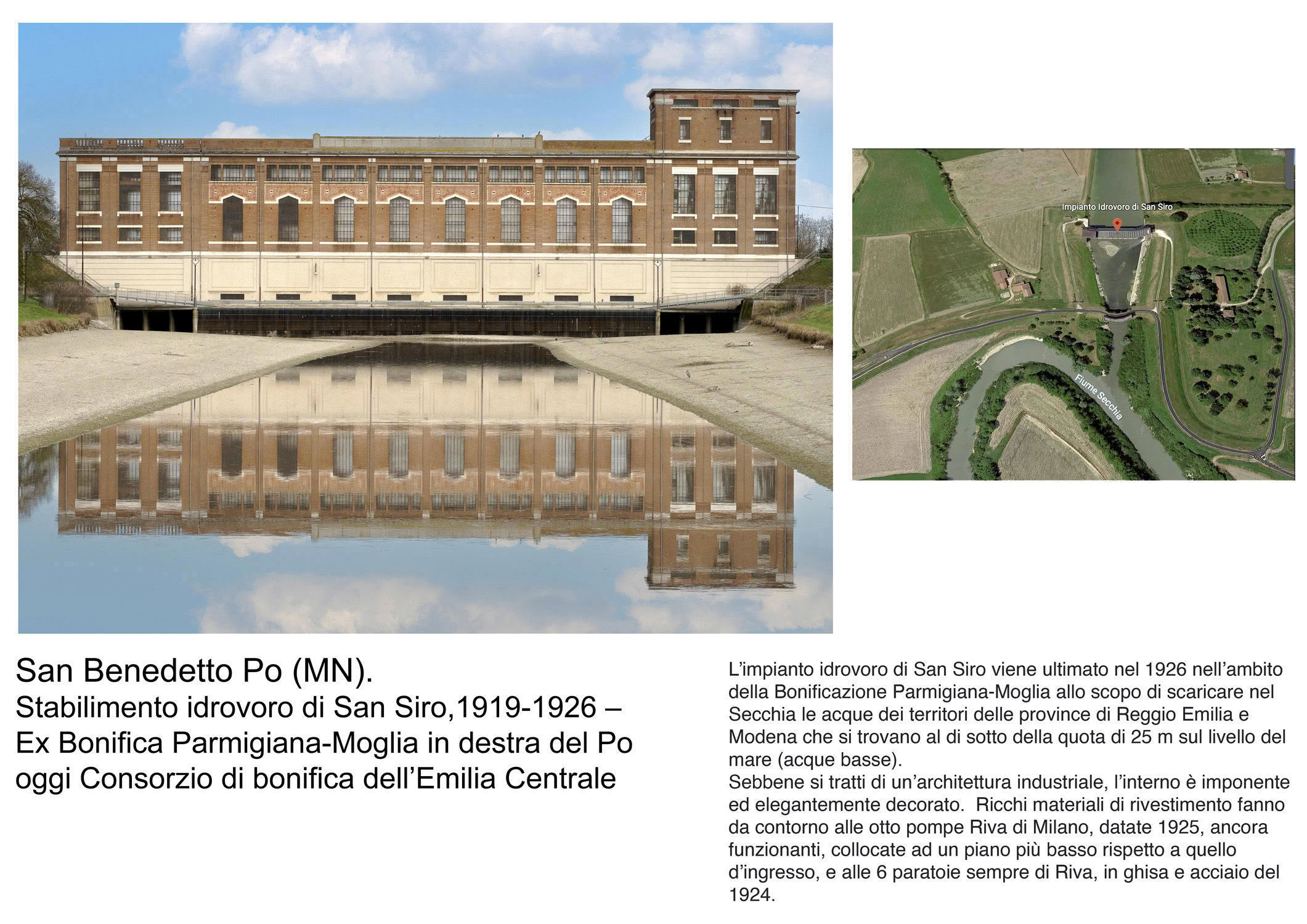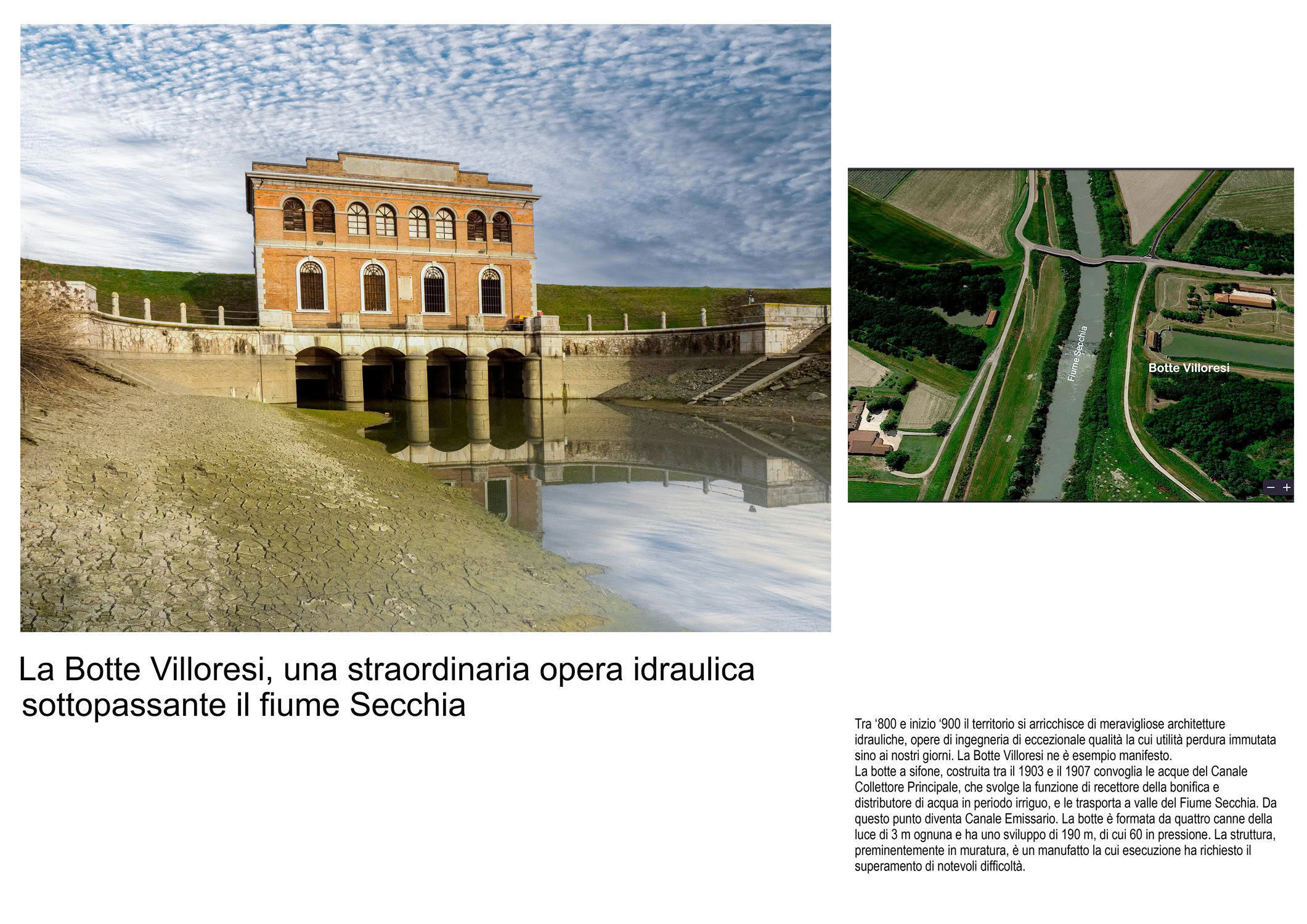 Un patrimonio che comprende le principali "cattedrali dell’acqua", capolavori di archeologia industriale dedicata alla gestione delle acque di superficie e che, realizzati tra la metà dell’800 e la metà del ‘900, punteggiano l’ambiente emiliano-romagnolo e basso Mantovano, laddove canali, fiumi e terre si incontrano. Strutture eleganti e manutenute con cura, spesso inserite in contesti paesaggistici di rara bellezza, dove emerge la maestria secolare con cui gli uomini e la tecnica hanno governato il delicato rapporto tra le acque e i suoli.