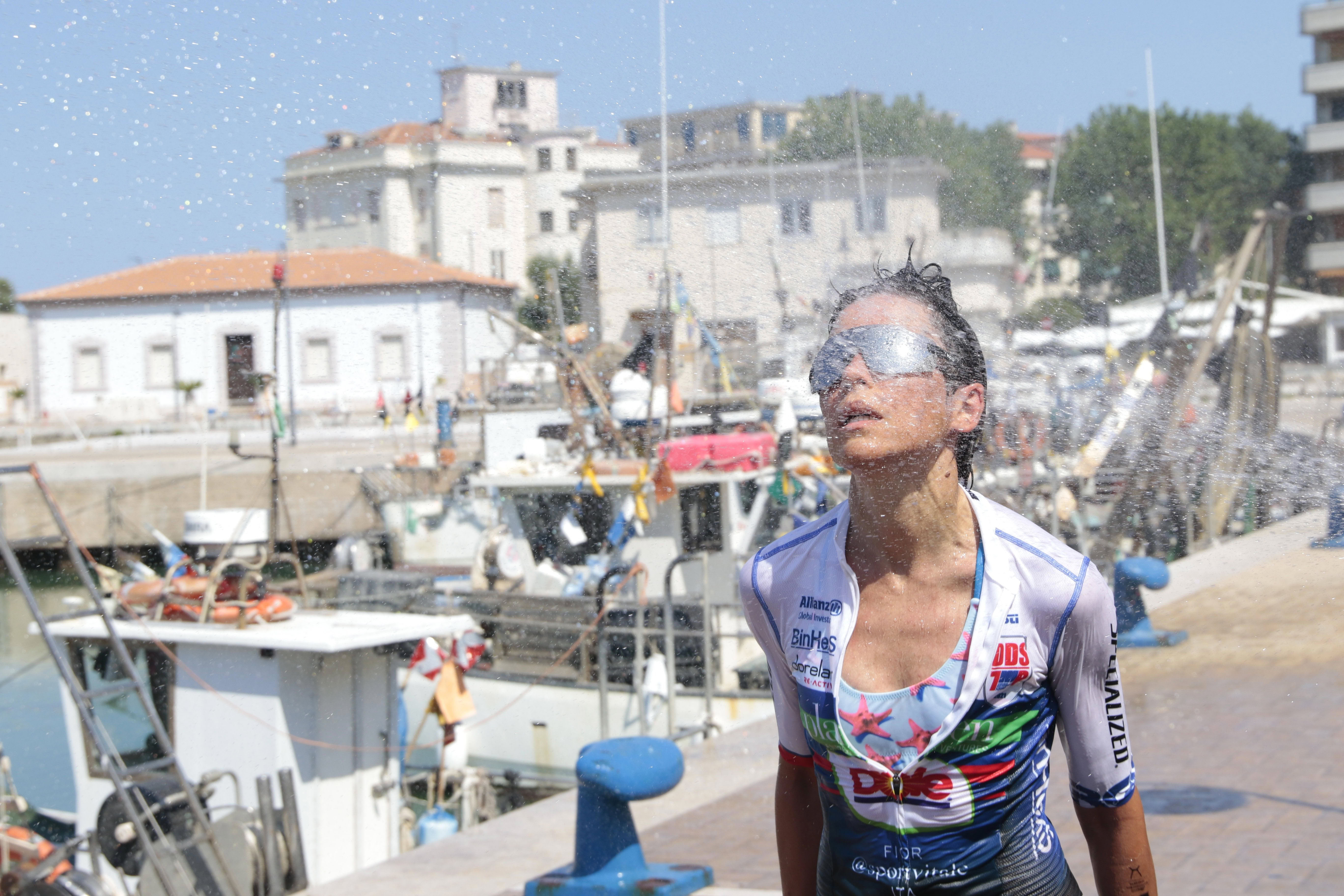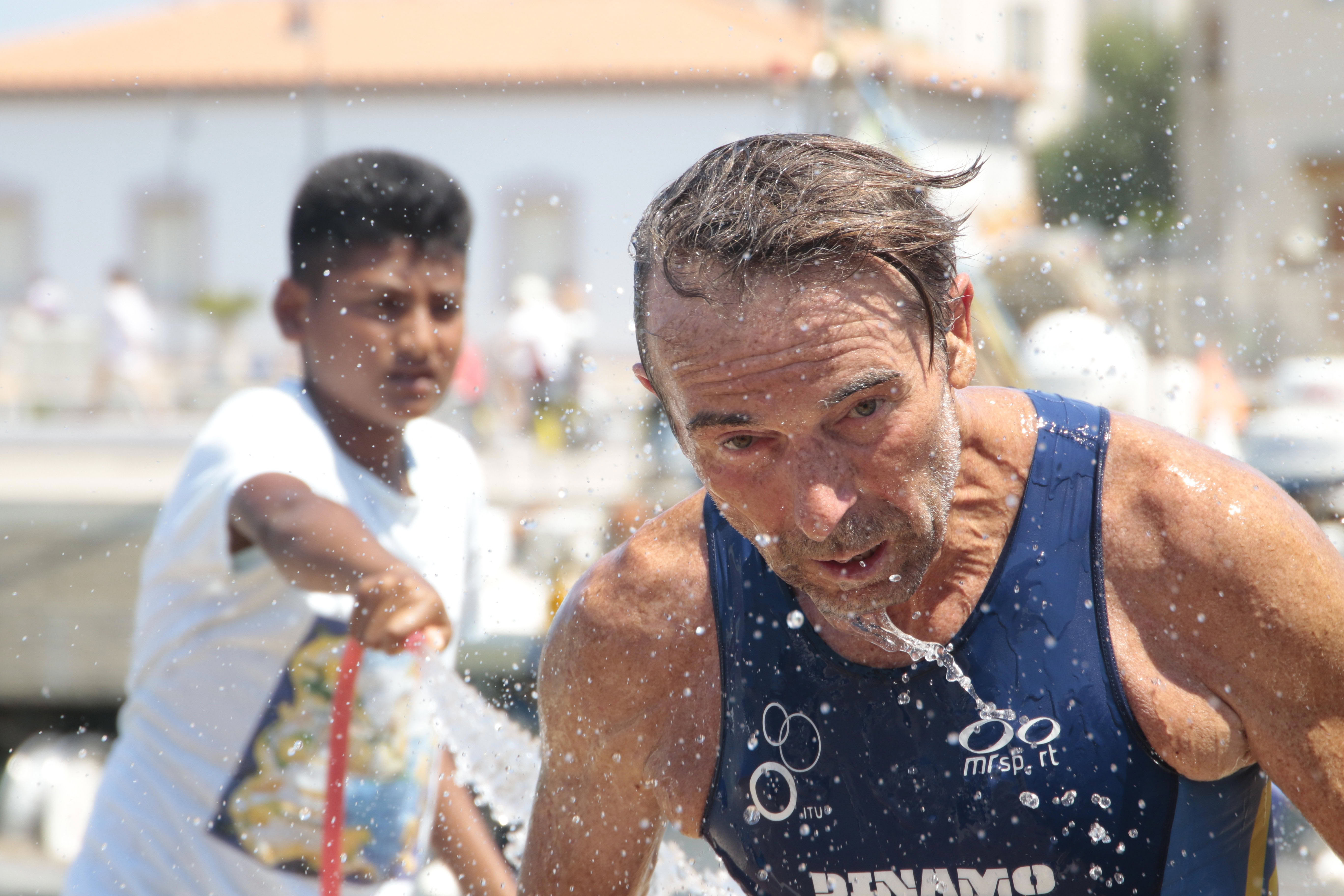 Nel mese di Luglio, come fotografa dell’agenzia “Endu” mi trovavo a Senigallia a seguire una competizione di triathlon che si tiene ogni anno. Attendendo sul molo l’arrivo dei corridori mi chiedevo con quale forza riuscissero a gareggiare. Vicino a me alcuni pescatori riordinavano le barche e le preparavano per il giorno successivo. Poco prima del passaggio degli atleti decisero di organizzare delle “docce” con i mezzi a disposizione…